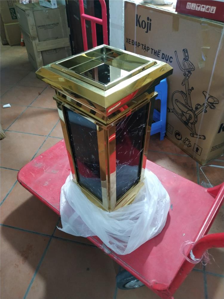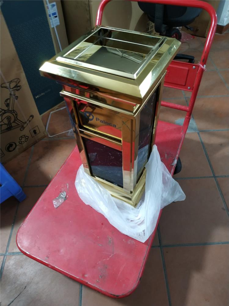 Thùng rác Paloca thiết kế lớp vỏ bên ngoài bằng inox mạ màu vàng và bốn mặt được ốp bằng đá hoa cương nhìn rất sang trọng, nổi bật, đẹp mắt. Chất liệu inox có ưu điểm là bộ bền cao, giữ màu tốt, không bị han gỉ khi tiếp xúc với môi trường rác thải bị ẩm ướt.