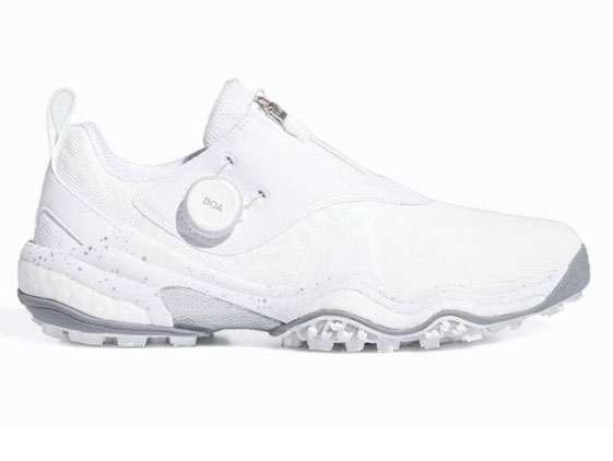 Giày golf Adidas Codechaos BOA 25 ID8605 sở hữu màu trắng trang nhã, có núm vặn xoay chỉnh độ ôm chân, thân giày may từ vải dệt kim chống thấm nước tốt.