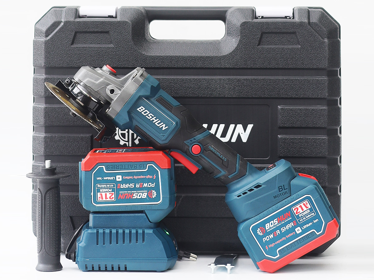 Máy mài, cắt dùng pin Boshun BS-AG100BL với công suất 850W, tốc độ 10,000 vòng/phút và hai pin dung lượng cao 21V, là công cụ lý tưởng cho mài, cắt sắt, gỗ và đá.