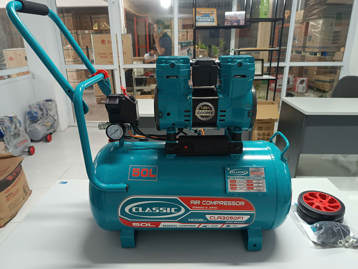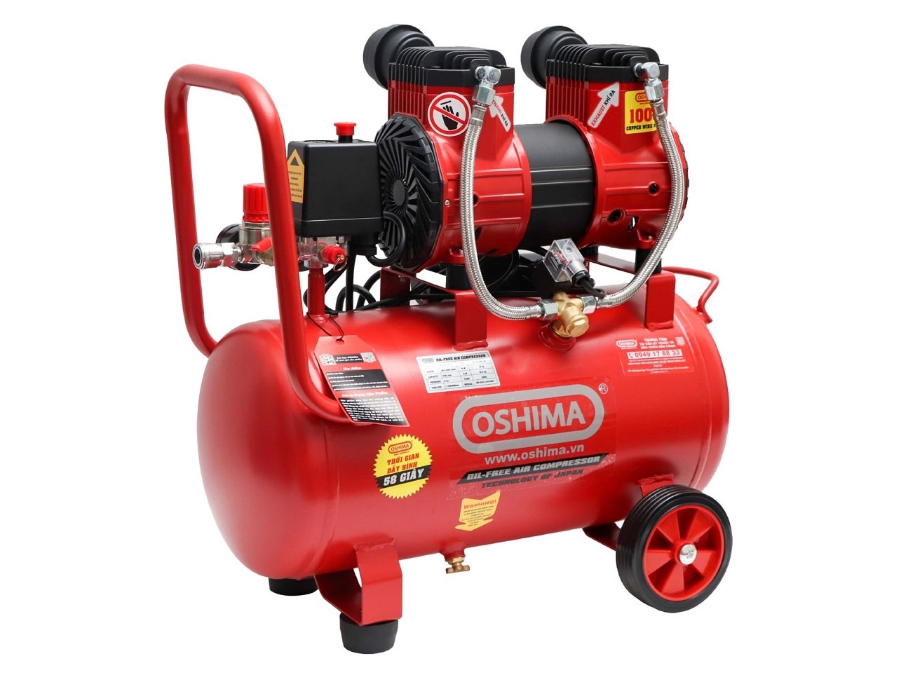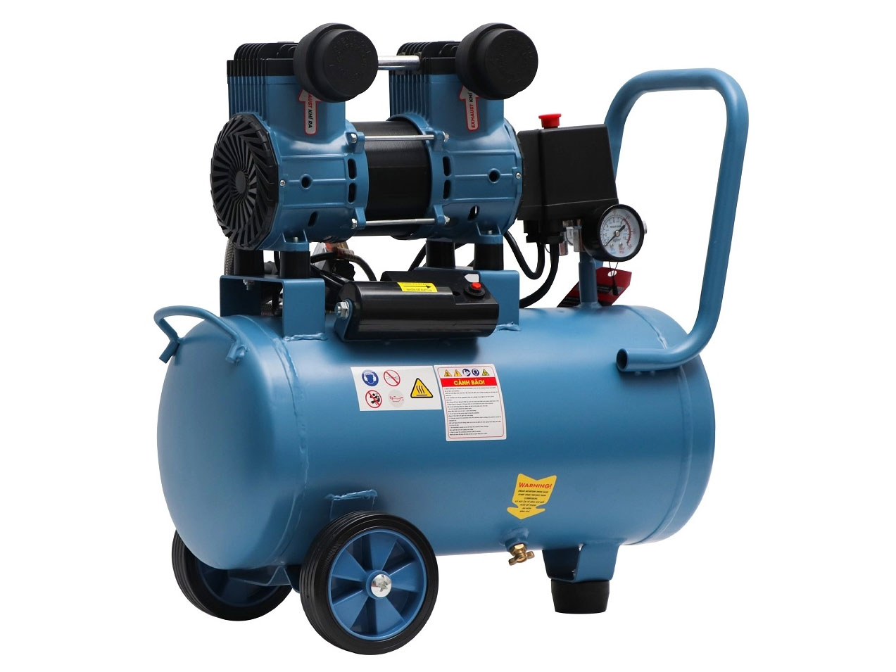 Máy nén khí không dầu giảm âm Wing 2HP TW-OF750x2 (TM-OF750) có dung tích bình 50 lít, lưu lượng khí sinh ra 180 lít/phút, bơm piston kép hạn chế tiếng ồn.