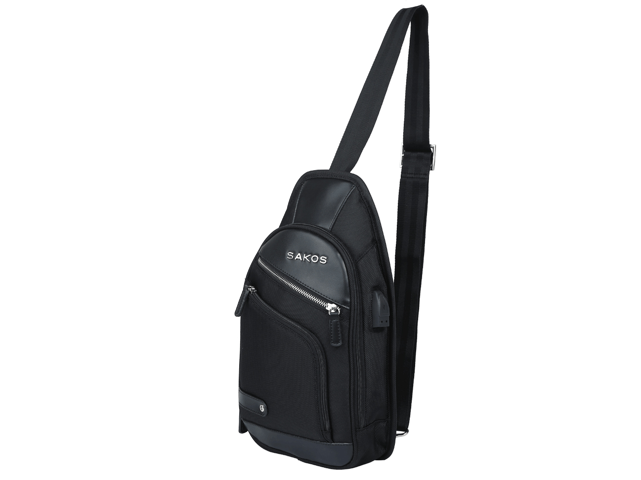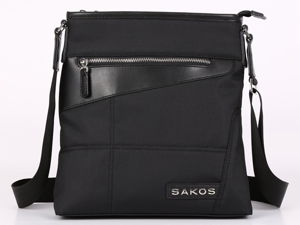 Túi đeo chéo Sakos Juvanis may bằng chất liệu Polyester, EVA, PE, PU chống thấm nước, tải trọng chịu được 5kg, có nhiều ngăn đựng.