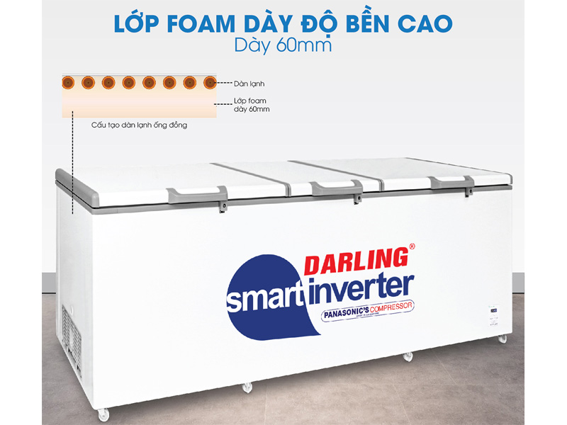 Bên trong lòng tủ đông Darling DMF 1279ASI là lớp foam dày 60mm cho khả năng giữ nhiệt lâu dài, cách nhiệt hiệu quả nhằm hạn chế thất thoát hơi lạnh ra bên ngoài.