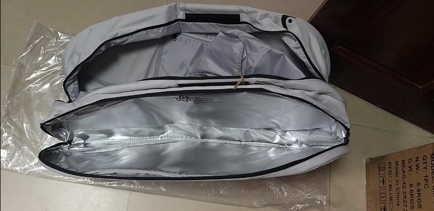 Bao vợt tennis sở hữu màu xám đen với kích thước là 76.5cm x 33cm x 32cm. Túi tennis thiết kế dạng balo và có thêm tay cầm phía trên.