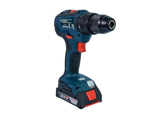 Máy khoan pin Bosch GSR 18V-50 điều chỉnh được tốc độ ở 2 mức, có đảo chiều bắt vít, kèm 2 pin sạc 18V 2Ah, bộ sạc và hộp đựng bảo quản.