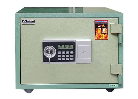 Két sắt chống cháy Hòa Phát KS50NDT sử dụng 1 bộ khóa chìa và 1 ổ khóa điện tử có đổi được số theo ý muốn, mặt nạ hộp nhựa.