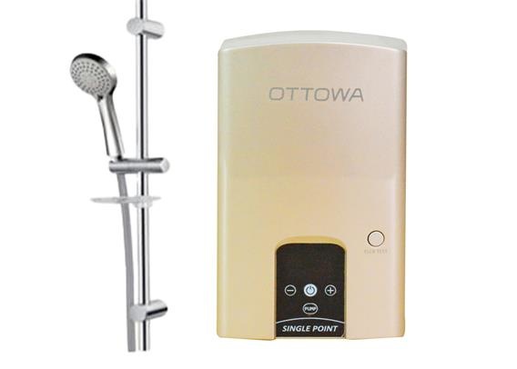 Máy nước nóng trực tiếp có bơm trợ lực OTTOWA TH45P02 có vỏ chống thấm nước, đi kèm 1 vòi hoa sen và giá treo vòi hoa sen.