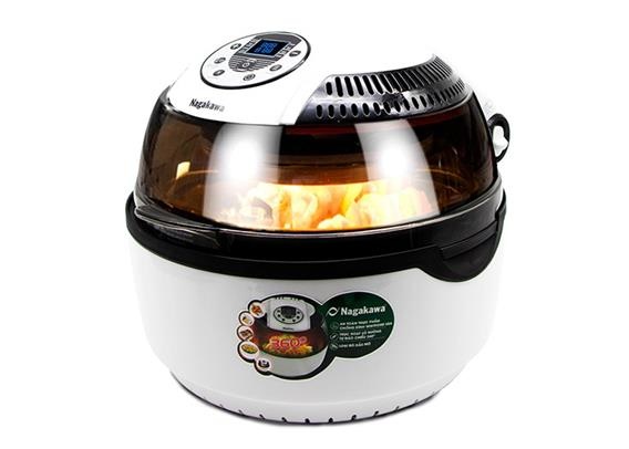 Nồi chiên không dầu xoay 360 độ Nagakawa NAG3303 sẽ làm giảm đến 80% lượng mỡ dư thừa trong thực phẩm, dung tíc lò là 9 lít, có chống dính, trục xoay 360 độ.