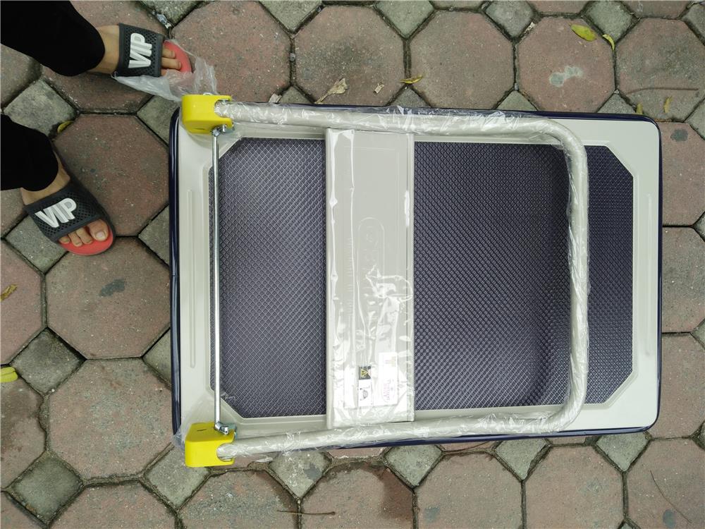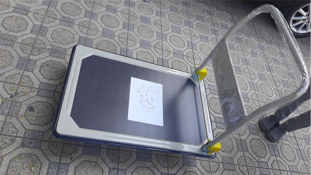 Xe đẩy hàng 4 bánh thiết kế mặt sàn có vân sần chống trơn trượt hiệu quả, đồng thời các góc được bọc nhựa tránh va đập, an toàn cho hàng hóa trên xe.