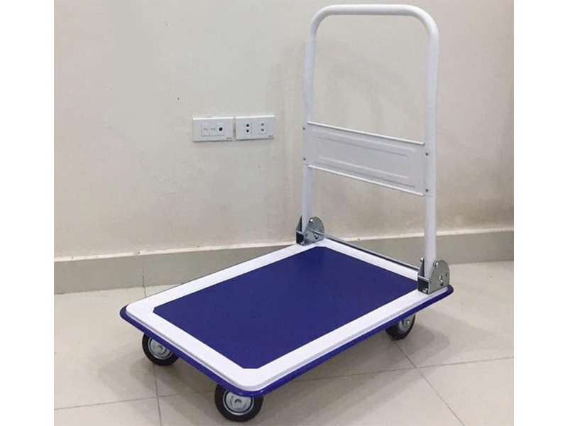 - Khi cần đẩy hàng, để xe ở gần thùng hàng rồi nhấc thùng hàng lên sàn xe. Dùng chân đẩy nhẹ phần đuôi xe đồng thời kéo tay cầm nghiêng về đằng sau. Lúc này, bạn đã có thể thoải mái đẩy hàng tới nơi cần thiết mà không mất quá nhiều sức lực.