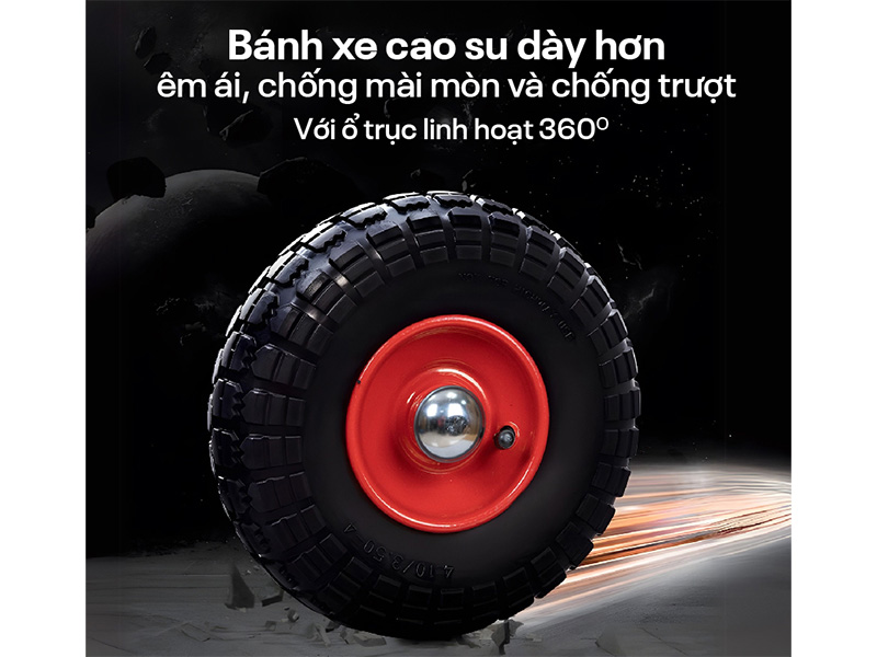 Xe đẩy hàng Fujihome được trang bị bánh xe cỡ lớn với đường kính 10 inch (25.4cm) giúp di chuyển linh hoạt trên nhiều loại địa hình. Bánh xe làm từ chất liệu thép kết hợp cao su đặc, chống mài mòn, bền bỉ theo thời gian. Hệ thống bạc đạn được tích hợp vào bánh xe giúp vận hành trơn tru và êm ái, nổi bật hơn so với các dòng xe đẩy thông thường.