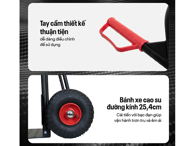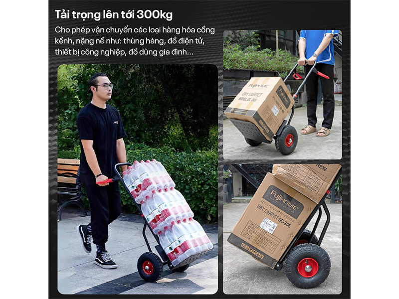 Khung xe được làm từ thép ống chịu lực chất lượng cao, đảm bảo độ bền vượt trội và khả năng chịu tải tối đa lên đến 300kg, lý tưởng cho việc di chuyển hàng hóa nặng. Bàn đỡ rộng rãi với kích thước 310x290mm giúp dễ dàng đặt và cố định hàng hóa, đảm bảo an toàn trong quá trình vận chuyển.